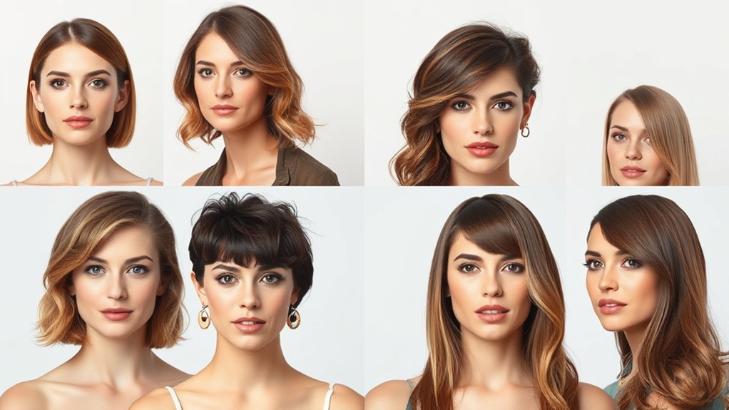 Understanding your face shape helps you pick hairstyles that highlight your best features and boost your confidence. If you have a round face, opt for layered styles with volume on top to create length. For square faces, softer waves and longer layers soften strong angles. Heart-shaped faces benefit from styles that balance the forehead and chin, like chin-length bobs. Keep exploring to discover personalized tips that will enhance your natural beauty even further.