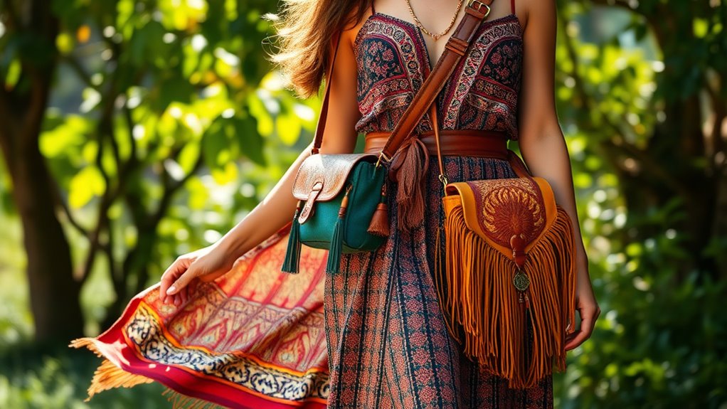 To style belt bags and crossbody bags boho way, choose designs with woven, leather, or embroidered details that reflect natural textures and earthy tones. Pair these bags with flowy skirts, embroidered tops, or distressed denim for a relaxed, free-spirited vibe. Layer with jewelry, hats, or scarves to enhance the boho aesthetic. For more tips on creating effortless boho looks that perfectly combine style and function, keep exploring how these accessories can elevate your wardrobe.