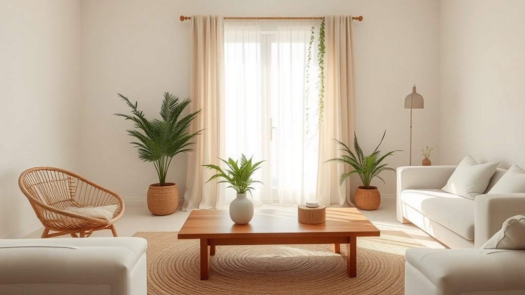 Imagine walking through a forest, feeling the natural textures beneath your fingertips. To choose sustainable and eco-friendly materials, prioritize products with sustainable sourcing and eco-friendly finishes. Look for certifications like FSC or Green Guard, and opt for reclaimed wood, organic textiles, and low-VOC paints. These choices help you create a minimalist boho space that’s both beautiful and kind to the planet, ensuring your home reflects your values.