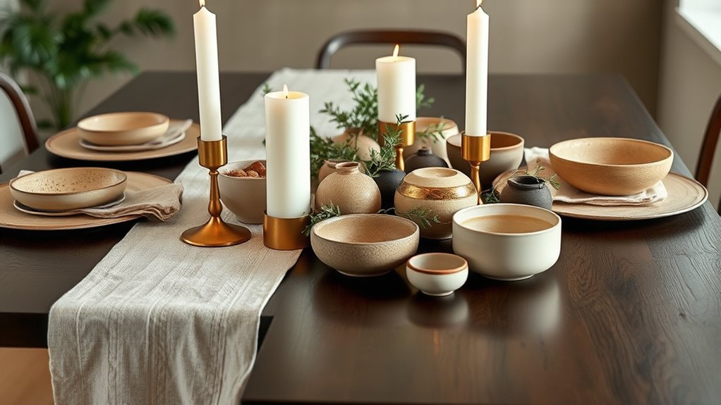 Candles are a versatile element that instantly elevates your table’s elegance. Use varying heights and sizes for visual interest, and consider the overall ambiance you want to create. Tall taper candles in sleek holders add sophistication, while clustered pillar candles evoke warmth and coziness. When incorporating candles, ensure they’re placed safely, away from flammable materials, and that they won’t obstruct guests’ view. Through careful color coordination, you can match your candles to your runner or ceramics, creating a cohesive look. For instance, white candles with gold accents work wonders on a table featuring blush ceramics and a blush-colored runner.