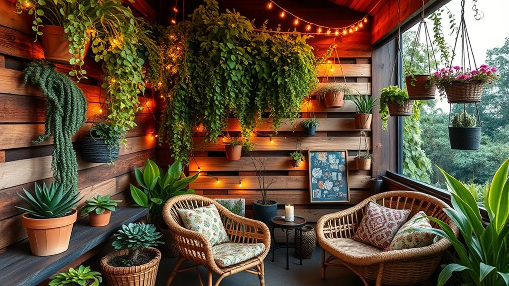 - Enhance your boho aesthetic with hanging pots, fairy lights, and natural decor elements for a vibrant, eclectic vibe.