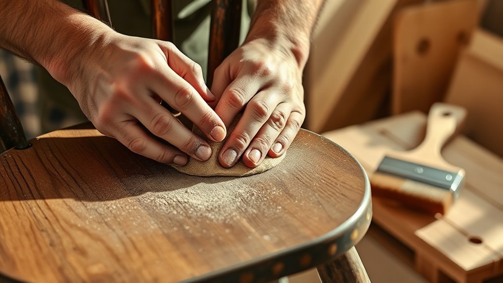 You should wear protective gear like a dust mask, safety goggles, and gloves to shield yourself from harmful particles during sanding and sealing. Make certain proper ventilation in your workspace to avoid inhaling fumes and dust, which can be dangerous. Keep the area well-ventilated by opening windows or using fans. These precautions protect your health while helping you work safely and effectively on your furniture project.