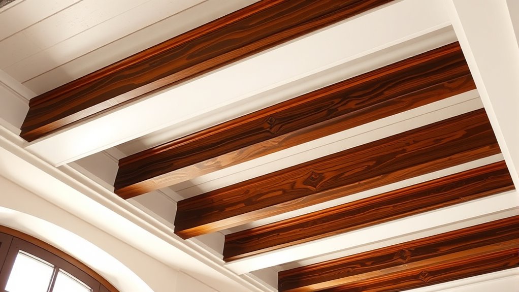 Yes, ceiling beams can be used in low-ceiling rooms if you opt for hidden ceiling designs or lightweight beam materials. During ceiling beam installation, choose slim, low-profile beams that don’t overwhelm the space. This approach adds architectural interest without making the ceiling feel lower. Hidden ceiling designs also help conceal beams, maintaining an open, airy feel while still benefiting from the aesthetic appeal of beams.