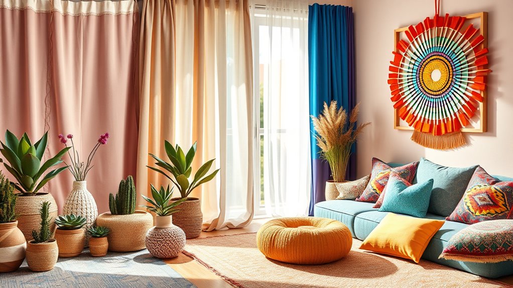 You should opt for light, airy boho color palettes that make small spaces feel larger and inviting. Use natural dye palettes featuring soft earth tones like sandy beiges, gentle terracottas, and muted greens to evoke calming boho color symbolism. Incorporate accents of warm spice hues or vibrant jewel tones sparingly for energy. These choices help create a balanced, cozy environment while highlighting the natural, relaxed vibe of boho decor.