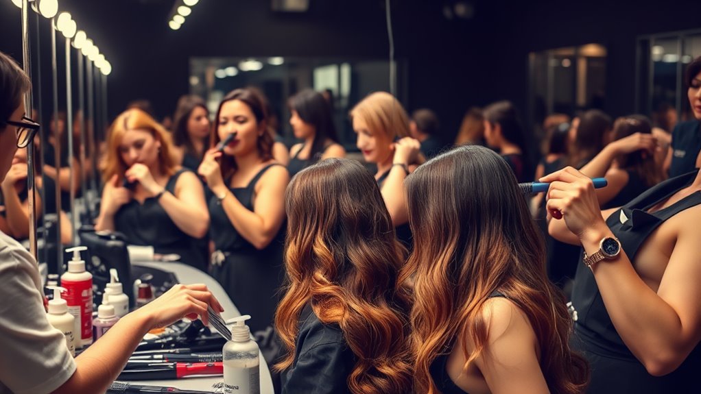 When handling quick changes during filming, you use specialized quick change techniques and styling rapid fire to save time. You prepare multiple hairstyles and accessories in advance, making shifts seamless. You stay organized, swiftly swapping wigs, hairpieces, or adjusting styles without disrupting the scene. Staying calm and efficient helps you meet tight schedules, ensuring each character looks perfect with minimal downtime. Your skill in quick change techniques keeps production running smoothly.