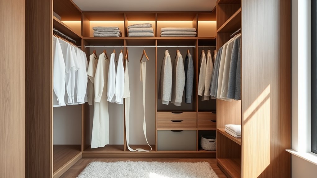 To maintain your capsule wardrobe seasonally, start with seasonal switching by swapping out clothes that no longer suit the weather. Use wardrobe rotation to keep your collection fresh and functional, removing items you won’t need until next season. Regularly evaluate your pieces for wear and fit, and only add versatile items that match your core style. This approach keeps your wardrobe streamlined and ready for each season’s demands.