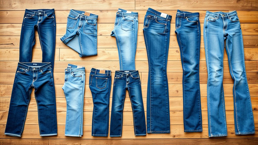 Next is the inseam length, which determines how long your jeans fall and how they interact with your footwear. A longer inseam that stacks at the ankle can elongate your legs, perfect for taller individuals or those who want a trendy, relaxed look with boots or sneakers. Cropped jeans with a shorter inseam suit those who want to showcase their footwear or create a more modern vibe. If you’re petite, opt for a tailored inseam that hits just above the ankle to avoid overwhelming your frame. Conversely, taller folks can choose longer inseams to maintain proportion and avoid bunching or pooling at the ankles. The key is to match inseam length with your body shape and style goals, ensuring your jeans fit cleanly and comfortably. Additionally, understanding denim stretch and recovery can help you select jeans that maintain their shape over time.