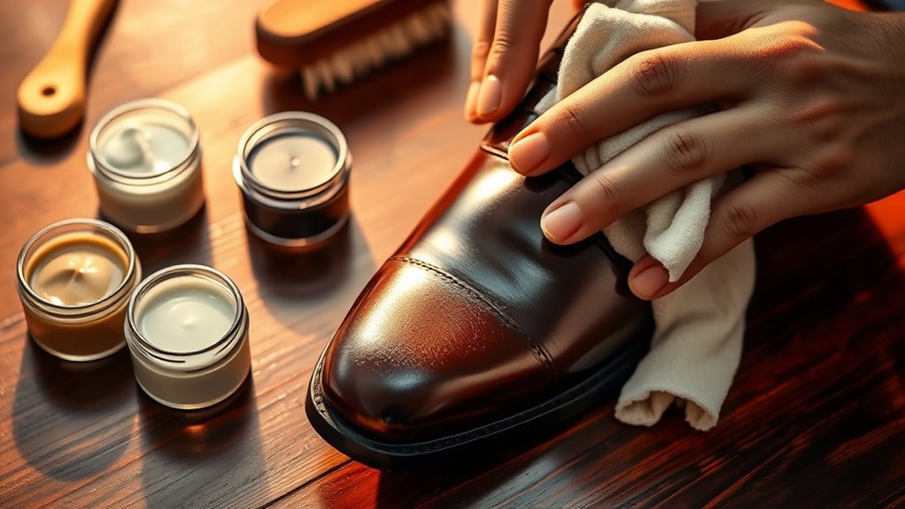 You should polish your leather shoes about every 2-4 weeks, depending on your shoe polish schedule and how often you wear them. Regular polishing helps maintain their shine and protects the leather. If you notice scuffs or dullness, it’s time for a quick touch-up. For daily wear, more frequent polishing might be necessary. Consistent leather maintenance frequency guarantees your shoes stay looking great and last longer.