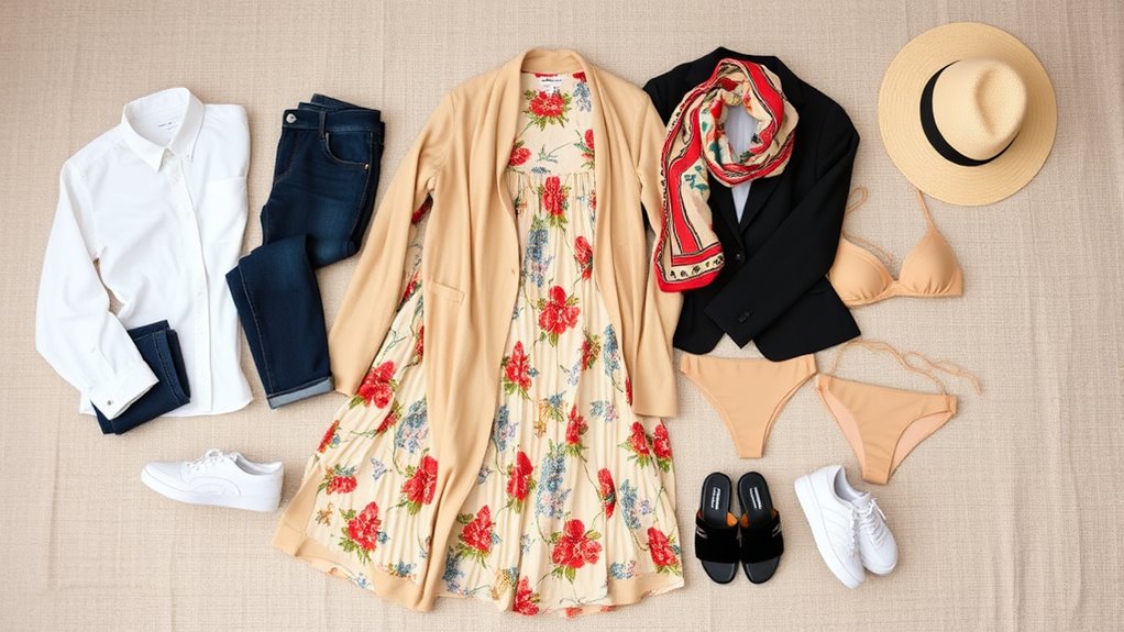 When packing for different activities, focus on versatile outfit planning by choosing pieces that mix and match easily. Layer items for various weather conditions, and pick neutral colors to simplify coordination. Incorporate color-coordinated accessories to quickly elevate your look for outings or formal events. This approach keeps your suitcase light and makes sure you’re prepared for all activities, whether sightseeing, dining, or relaxing.