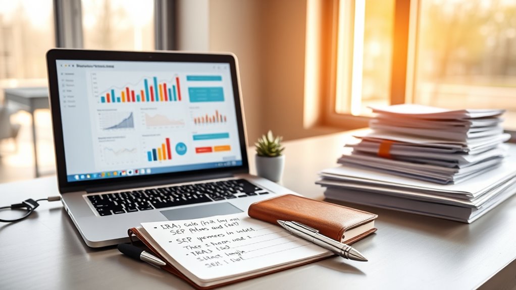 As a self-employed individual, you should consider retirement options like an IRA, Solo 401(k), or SEP IRA to secure your financial future. IRAs offer flexible investment choices, while Solo 401(k)s allow higher contributions and Roth options for tax-free growth. SEP IRAs are simple to set up and ideal for sizable savings. Choosing the right plan depends on your goals and business details. Keep exploring to find out how each option can best serve your retirement needs.