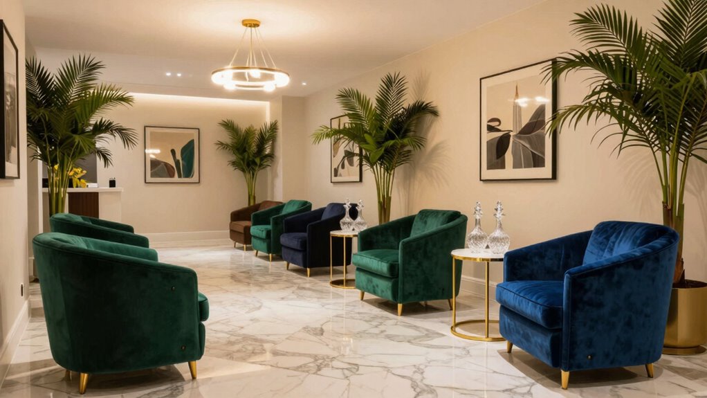 You might think cheap vinyl or polyester scream luxury, but instead, opt for luxury fabric choices like velvet, silk, or high-quality leather—they instantly elevate your space. Add statement decor accents like marble surfaces or gold finishes to deepen the sense of elegance and comfort. These materials and accents balance opulence with a welcoming vibe, making your waiting area feel intentionally luxurious rather than just expensive.
