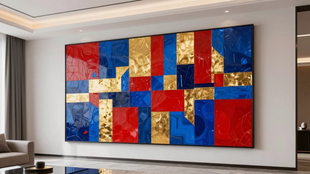Oversized wall art is a bold way to transform any room and make a striking visual statement. When you choose an oversized piece, you’re instantly drawing attention and setting the tone for the entire space. It’s not just about filling blank wall space; it’s about creating a focal point that exudes personality and style. To maximize its impact, consider how it interacts with the rest of your decor, especially elements like a gallery wall or carefully curated color schemes. A gallery wall, for example, can serve as a dynamic backdrop or complement to your oversized art. You can balance the scale by mixing smaller frames with a large centerpiece, creating visual harmony. When planning this, pay attention to how the colors in your gallery wall connect with your oversized piece, ensuring they don’t clash but rather enhance each other through thoughtful color coordination. Incorporating sustainable decor ideas can also elevate your space while supporting eco-friendly practices. Color coordination is essential when working with oversized wall art. You want your art to stand out, but not in a way that feels jarring. Think of your room’s existing palette and select artwork that complements or accents those colors. For example, if your room features cool tones like blues and grays, choose oversized art with similar hues or subtle contrasts to create a cohesive look. Conversely, if you want your art to pop, pick a piece with bold, contrasting colors that still harmonize with your overall decor. The key is to strike a balance—so your oversized art becomes a statement piece without overwhelming the space or feeling disconnected from the rest of your decor. When you hang oversized wall art, consider its placement carefully. It should be at eye level or slightly above, depending on your ceiling height and furniture arrangement. You don’t want it to feel lost or cramped against the wall. When integrating it with a gallery wall, leave enough space around the large piece so it doesn’t compete for attention but instead anchors the whole display. Proper spacing and alignment are essential; they help the art feel intentional and polished.