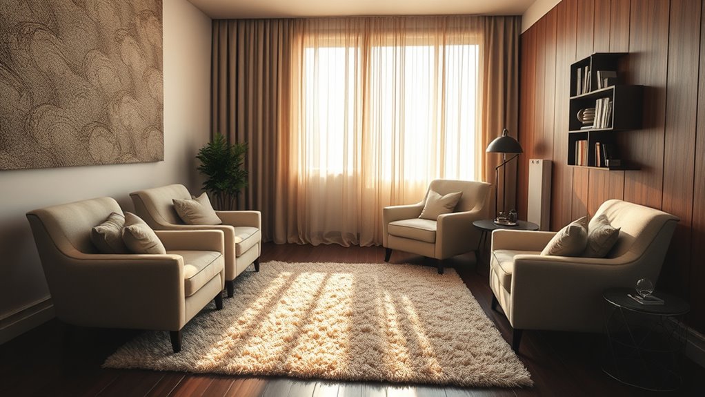 To enhance acoustic comfort in your home, you can combine sound masking with acoustic panels, creating a more peaceful environment. Use gentle background noise to mask distractions and absorb sound waves with panels that reduce echoes and external noise. Proper placement and consultation with specialists can optimize results. Small adjustments can make a big difference in your living space. Keep exploring to discover even more ways to create a tranquil, sound-controlled home.