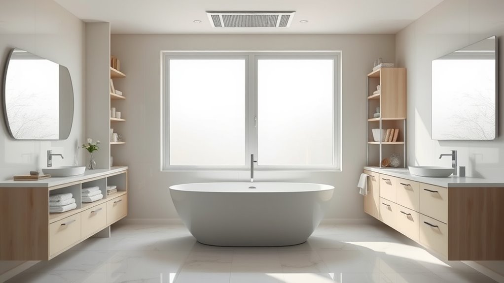 Speaking of ventilation, it’s indispensable to incorporate effective systems to keep your bathroom dry and fresh. A well-placed exhaust fan helps remove excess moisture and odors, reducing the risk of mold. Position the fan near the shower or wet areas for maximum efficiency, and make sure it vents directly outside to prevent humidity buildup. Good ventilation also helps preserve your waterproofing efforts, as excess moisture can weaken sealants and membranes if left unchecked. When planning your space, leave adequate clearances around fixtures to allow for comfortable movement and cleaning. This means not cramming in too many elements and ensuring there’s enough room for door swings, towel racks, and cabinets.