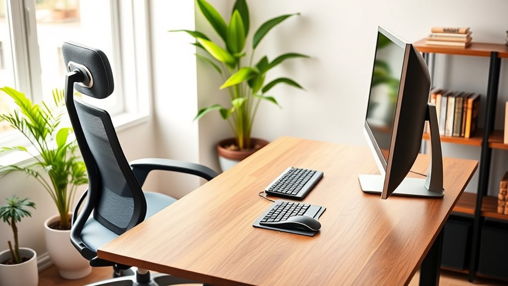 Ever wonder how your home workspace can impact your health and productivity? The way you set up your desk, chair, and screen can make a huge difference in how you feel during and after work. Small adjustments can prevent discomfort and boost your focus. One key aspect is keyboard positioning. You want your keyboard to be at a height where your elbows are bent at roughly 90 degrees, and your wrists stay straight. If your keyboard is too high or too low, you risk unnecessary strain on your wrists and forearms. Consider using a keyboard tray or adjusting your desk height so your arms are comfortably supported. Proper keyboard positioning isn’t just about comfort; it also prevents repetitive strain injuries like carpal tunnel syndrome, which can develop over time if ignored. Additionally, incorporating height-adjustable desks can help you easily switch between sitting and standing positions, promoting better ergonomics and reducing fatigue.