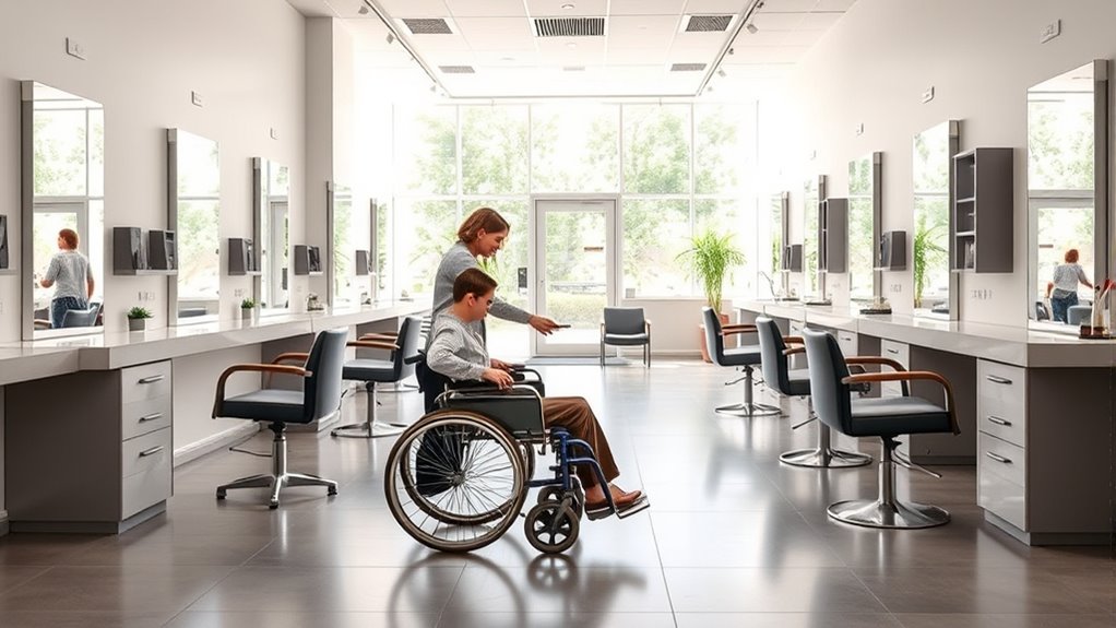 You should guarantee your staff receives training in staff sensitivity and disability awareness. This training helps them understand different disabilities, communicate effectively, and provide respectful, personalized assistance. By educating your team on accessibility needs, they can better support clients with disabilities, creating an inclusive environment. Regular updates and hands-on practice are essential to maintain sensitivity and confidence, ensuring every client feels comfortable and valued during their salon experience.