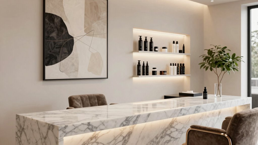 You should refresh your reception area at least every six months to keep it inviting. Regular updates to reception furniture guarantee comfort and modern appeal, while fresh signage design keeps your branding sharp and clear. This proactive approach shows clients that you care about their experience, making your salon stand out. Consistent refreshes create a welcoming atmosphere that leaves a lasting positive first impression, encouraging repeat visits.