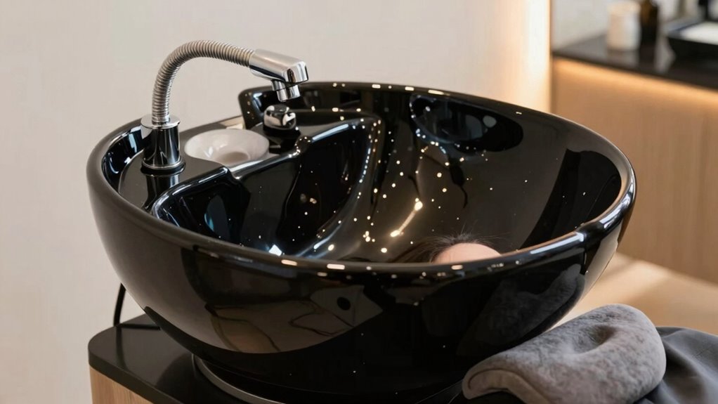 The design reduces water splash through a well-thought-out shape that directs water downward and inward, minimizing splattering. Efficient design features, like higher sides and smooth contours, help contain water and prevent it from splashing onto clients or surroundings. This design efficiency guarantees a cleaner, more comfortable experience, allowing you to focus on providing excellent service without worrying about messes. You’ll notice less water mess, making your work easier and more professional.