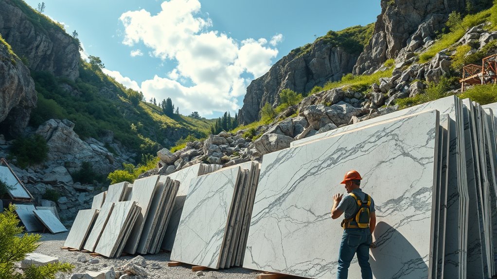 Sustainable practices in stone sourcing mean more than just eco-friendly extraction; they involve reducing waste, conserving energy, and minimizing environmental disruption. Reputable suppliers invest in modern quarrying techniques that lessen the ecological footprint. They often implement water recycling systems, use less invasive excavation methods, and restore land after extraction. These efforts guarantee that quarrying doesn’t deplete resources or harm local habitats. When you choose stones sourced through such practices, you actively support industry standards that prioritize environmental health. Additionally, transparent reporting on environmental impact helps ensure accountability and continuous improvement in sustainability efforts.