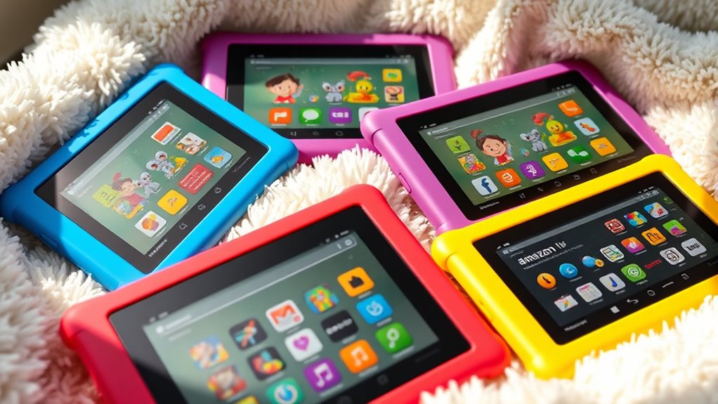 With over 80% of parents trusting Amazon Fire tablets for their kids, it’s clear they’re a popular choice for safe, fun, and educational entertainment. Whether you’re looking for a budget-friendly option or a more advanced device, there’s a Fire tablet that fits your child’s needs perfectly. Remember, choosing the right tablet can give your little one hours of safe exploration—making screen time both enjoyable and secure for your family.
