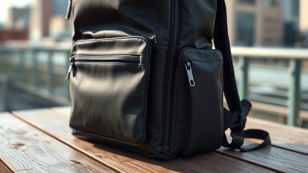 Durability and water resistance are essential factors to contemplate because they directly impact how well your backpack can withstand daily use and environmental challenges. I look for high-density nylon, polyester, or Oxford fabric, as these materials offer excellent resistance to tearing and abrasion, ensuring longevity. Water-resistant coatings like TPU or polyurethane layers are vital for protecting my belongings from rain, spills, and humidity, extending my backpack’s lifespan. I also prioritize features like water-resistant zippers and sealed seams, which prevent water ingress in wet conditions. Reinforced stitching and sturdy hardware, such as YKK zippers, boost resilience against wear and tear. Ultimately, I choose materials that balance durability with a lightweight design, so my backpack remains easy to carry without sacrificing protection from the elements.