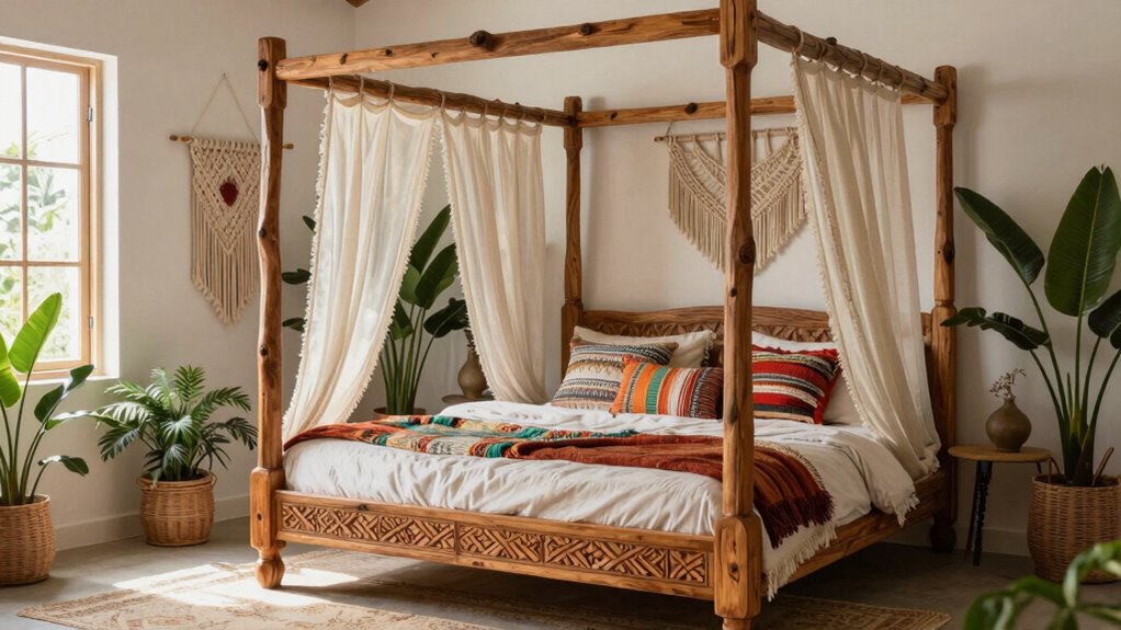 Absolutely, there are eco-friendly boho bed frames that are as stylish as they are sustainable! I’ve seen reclaimed wood frames that look like they’ve traveled through time, and bamboo options that grow faster than you can say “eco-conscious.” These choices reduce waste and often come from renewable sources. Trust me, going green never looked so chic, and you’ll feel good knowing your bed supports the planet!