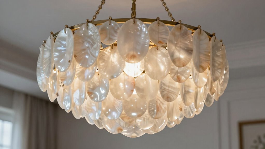 Did you know that a well-maintained chandelier can last over 20 years? I clean my capiz shell chandelier gently with a soft, damp cloth weekly to remove dust. I avoid harsh chemicals to prevent damage, and I occasionally use a gentle vacuum with a brush attachment. To keep it shining, I polish the shells with a mild, non-abrasive cleaner. Regular maintenance keeps it looking stunning and prolongs its beauty.
