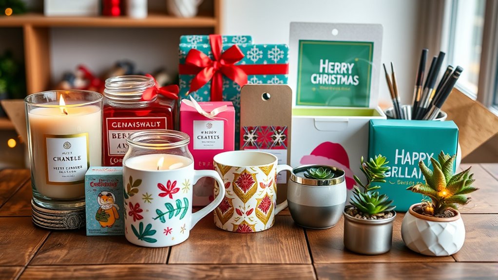 Since presentation can make a simple gift feel more thoughtful, paying attention to packaging is essential when selecting Christmas gifts for coworkers under $25. Attractive packaging enhances the perceived value of the gift and makes it ready to give without extra wrapping. Well-designed presentation, like decorative boxes or themed gift baskets, can elevate even budget-friendly items, making them feel special. Adding personal touches, such as handwritten notes or customized tags, gives a meaningful touch that shows effort. Using festive or holiday-themed materials can boost excitement and align with the Christmas spirit. Remember, neatness and attention to detail in packaging influence how the recipient perceives the gift, making the overall experience more memorable, regardless of the price point.