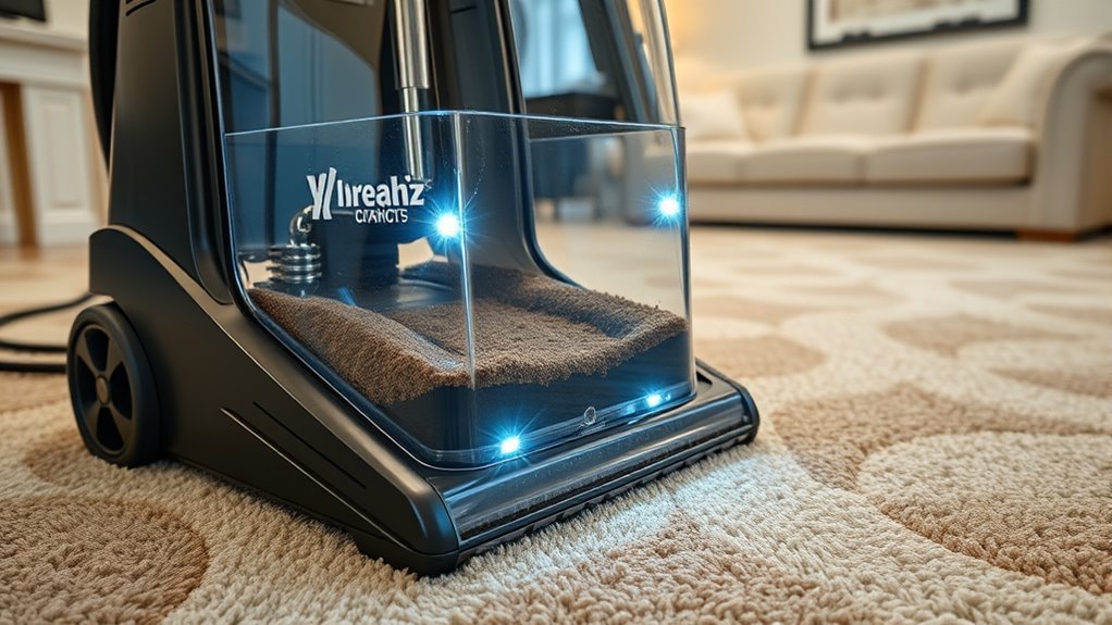 Imagine a powerful machine that not only cleans deeply but also keeps you safe. Look for safety features like automatic shut-off to prevent overheating, sturdy ergonomic handles for control, and low-vibration operation to reduce fatigue. A good extractor should also have slip-resistant wheels and clear warning labels. These features protect you while ensuring your home’s carpets look fresh and spotless, giving you peace of mind every time you clean.