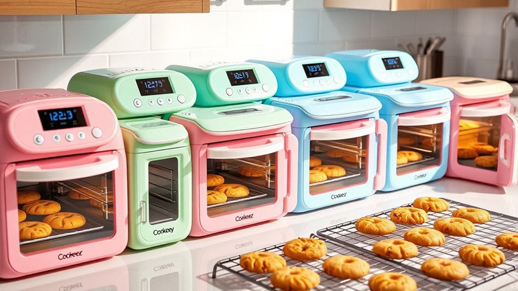 Cookeez Makery Ovens come with several safety features to keep you safe while baking. I’ve noticed they include automatic shut-off systems if the oven overheats, sturdy non-slip bases to prevent accidents, and cool-touch surfaces for safe handling. Plus, there are clear instructions and safety warnings. I always recommend reading the manual thoroughly to guarantee safe use. These features give me confidence when baking, knowing I’m protected from common hazards.