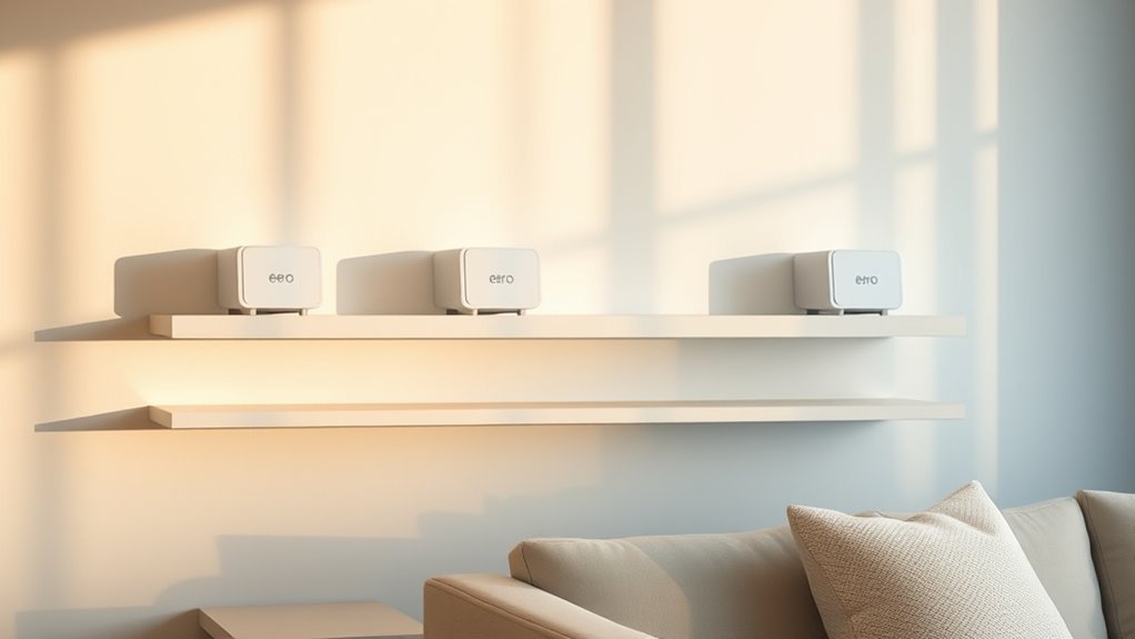 Choosing the right eero Wi-Fi mesh system also means considering how much it costs and fits into my budget. Prices vary widely, from affordable options around $100 to premium models over $1,000. I also need to account for extra accessories like wall mounts or extenders, which can add to the total investment. Subscription services like eero Plus, offering enhanced security and advanced features, typically cost $10-15 per month, increasing ongoing expenses. Larger systems with more units or advanced features generally come with higher upfront costs but can provide better coverage and performance for bigger homes. By evaluating my coverage needs, device count, and budget, I can choose a system that balances affordability with performance, ensuring I get the best value for my money.