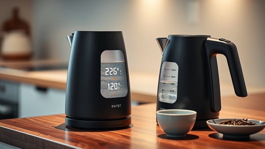 Safety features like auto shutoff are essential because they guarantee your kettle turns off automatically once the water reaches the desired temperature or if it’s left unattended. This prevents the kettle from boiling dry, reducing the risk of fire and appliance damage. Many models also include overheat protection, which automatically turns off the kettle if internal components get too hot, adding an extra layer of safety. Boil-dry protection further safeguards against accidents by disconnecting power when no water is detected. Combining precise temperature control with auto shutoff ensures your water is heated safely and accurately without overheating. These safety features not only minimize hazards but also provide peace of mind, making your kettle both safer and more reliable for everyday use.