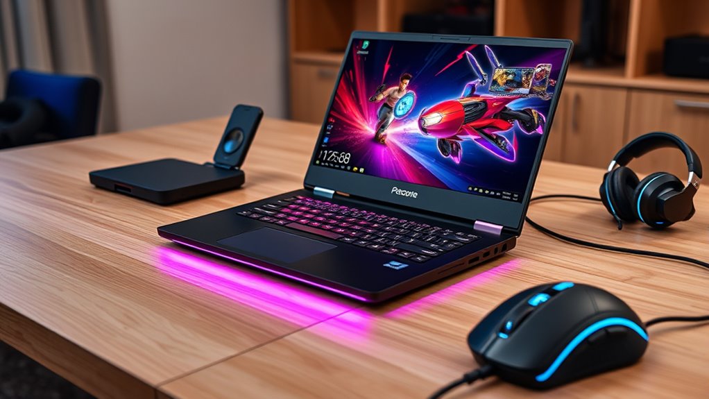 When choosing a gaming laptop under $1000, I focus on key factors like graphics capabilities, processor speed, and RAM to guarantee smooth gameplay. Storage options and display quality also matter, so I look for models that balance performance with visual clarity. Considering these points helps me find a machine that’s powerful without breaking the bank.