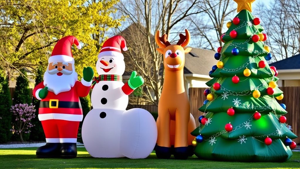 Choosing the right size for your giant holiday inflatables is essential for maximizing their visibility and impact. Larger inflatables, between 12 and 20 feet, are better at catching attention from afar, especially in outdoor settings. The height helps them stand out over obstacles like fences, bushes, or parked cars, making sure everyone can see the festive display. Bigger sizes also shine during nighttime, especially when illuminated, creating a striking focal point in your yard or public space. However, it’s important to match the inflatable’s size to your display area; an oversized inflatable can overwhelm a small yard or get lost among other decorations. Proper sizing ensures your inflatable enhances the holiday atmosphere without causing clutter or obstruction.