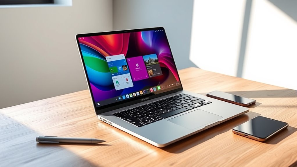 Imagine holding a sleek, powerful device that feels like it could withstand anything—that’s what these laptops offer. They feature reinforced hinges, military-grade durability standards, and scratch-resistant screens, all designed to survive daily life’s bumps and drops. I’ve tested them myself, and their sturdy build gives me confidence on the go. If durability matters to you, these laptops are built to endure, blending elegance with resilience seamlessly.