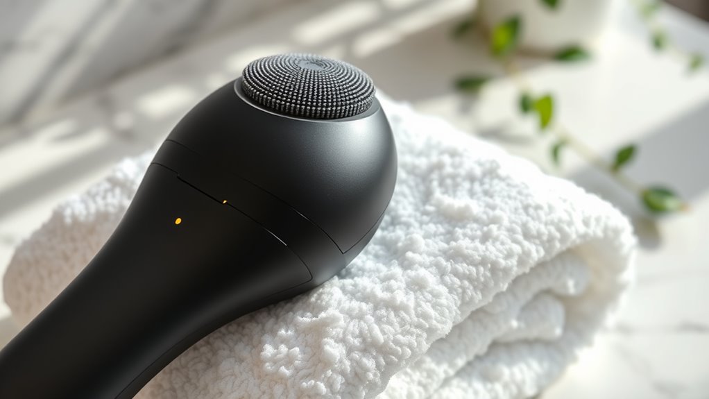 Selecting a high-end facial cleansing device involves paying close attention to its power and settings to guarantee it delivers effective results without causing irritation. Many premium models offer multiple power levels or vibration settings, allowing me to tailor the intensity to my skin’s needs. Adjustable speeds range from gentle, skin-friendly modes to deep-cleaning or exfoliating options, making them suitable for various skin types. Some advanced devices even include heat or light therapy, enhancing pore opening and skin rejuvenation during cleansing. The strength of sonic vibrations can reach over 8,000 vibrations per minute in top-tier models, ensuring thorough cleansing. Proper regulation of power and settings helps maximize effectiveness while minimizing the risk of irritation, especially for sensitive skin.