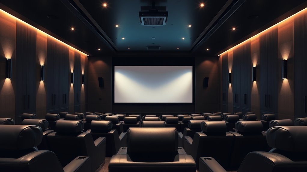 Brightness and contrast are fundamental factors that directly affect your home theater experience; higher brightness guarantees vivid images even in well-lit rooms, while a superior contrast ratio brings depth and realism to every scene. High-end projectors often exceed 2,500 lumens for indoor use or 4,000 lumens for outdoor settings, ensuring images remain bright without washing out. Contrast ratio, such as 10,000:1 or higher, determines the difference between blacks and whites, adding depth and detail, especially in dark scenes. HDR support enhances contrast by dynamically adjusting brightness and tone mapping, making images more lifelike. Achieving ideal contrast requires a combination of high lumen output, advanced image processing, and a viewing environment with controlled ambient light, ensuring cinematic excellence regardless of lighting conditions.