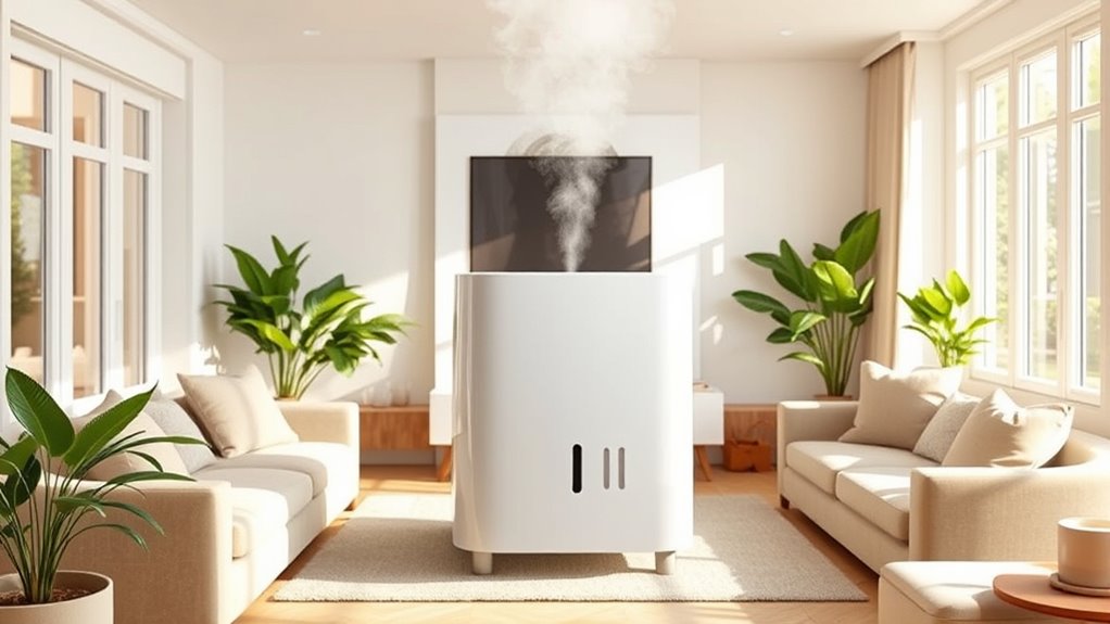 Choosing the right humidifier size depends largely on your space, as an undersized unit won’t adequately humidify a large area, while a too-powerful model can lead to over-humidification and potential issues. For rooms up to 2,000 sq.ft., medium-sized humidifiers with capacities around 4 to 6 gallons are typically enough to maintain proper humidity levels. Larger spaces, like those between 3,000 and 10,000 sq.ft., require high-capacity models that output 12 to 34 gallons daily, ensuring even moisture distribution. For very large homes, matching the humidifier’s coverage area to your total square footage is vital. An accurate assessment of your space guarantees consistent humidity, preventing problems caused by insufficient or excessive moisture. Proper sizing keeps your whole house comfortable and safe.