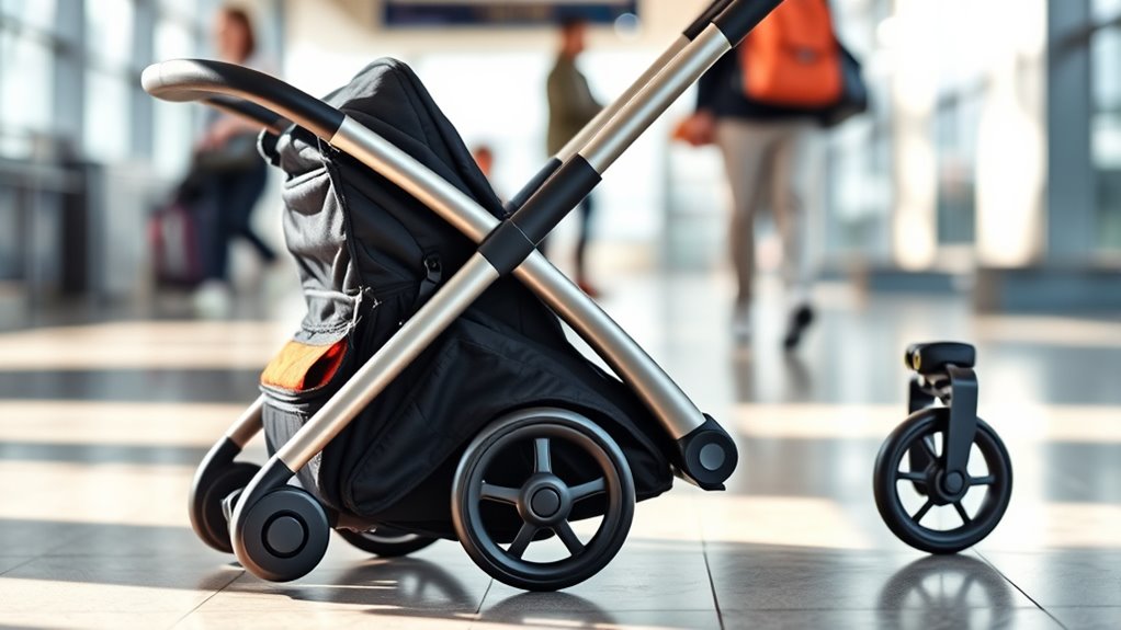 Ensuring a stroller folds easily can make travel much smoother, especially when you’re managing a baby and luggage at the same time. Look for a one-hand folding mechanism that lets you collapse the stroller quickly without needing help. The fold should be smooth and require minimal effort, so you can do it effortlessly even when holding your little one or juggling other items. A compact, self-standing fold is a huge plus since it lets the stroller stand upright on its own, saving space and making storage easier. Pay attention to the folded dimensions—ideally, it should fit into overhead compartments or tight storage spaces. ultimately, choose a stroller with a durable fold mechanism and frame, so it withstands frequent use without breaking down.
