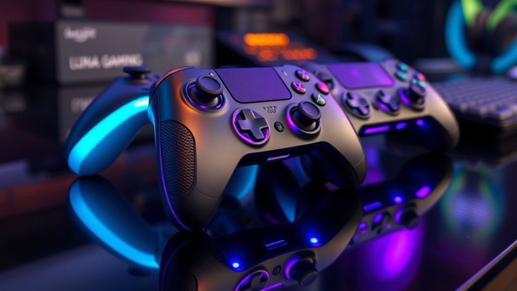 Have you ever wondered if a more expensive Luna controller truly delivers better value? Prices range from around $25 for basic models to over $70 for premium options, which substantially impacts overall value. Higher-priced controllers often include advanced features like programmable paddles, turbo buttons, and better ergonomics, making them worthwhile for serious gamers. However, budget controllers might lack durability, responsive feedback, or compatibility with multiple devices, reducing their long-term worth despite the lower cost. When evaluating price, consider features like rechargeable batteries, low-latency connectivity, and multi-platform support, which can enhance your gaming experience. Comparing cost with performance, build quality, and versatility helps ensure you choose a controller that offers the best balance of price and value for your needs.