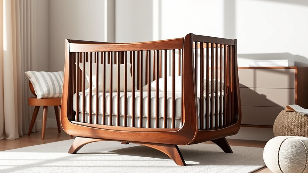Choosing a luxury convertible crib means prioritizing safety alongside style and functionality. I recommend looking for cribs that are GREENGUARD Gold Certified, as this indicates they meet strict chemical emission standards, ensuring a healthier indoor environment for your baby. It’s also essential to verify the crib complies with safety standards set by the CPSC, ASTM, and JPMA, which guarantee structural integrity and child safety. Additionally, check that the crib has undergone third-party testing for toxins, lead, and phthalates, confirming the materials are non-toxic and safe. Opt for models with adjustable mattress heights that adhere to safety guidelines, preventing your child from climbing out or falling. Finally, ensure all safety certifications and features are well-documented and current, so you stay compliant with evolving safety regulations.