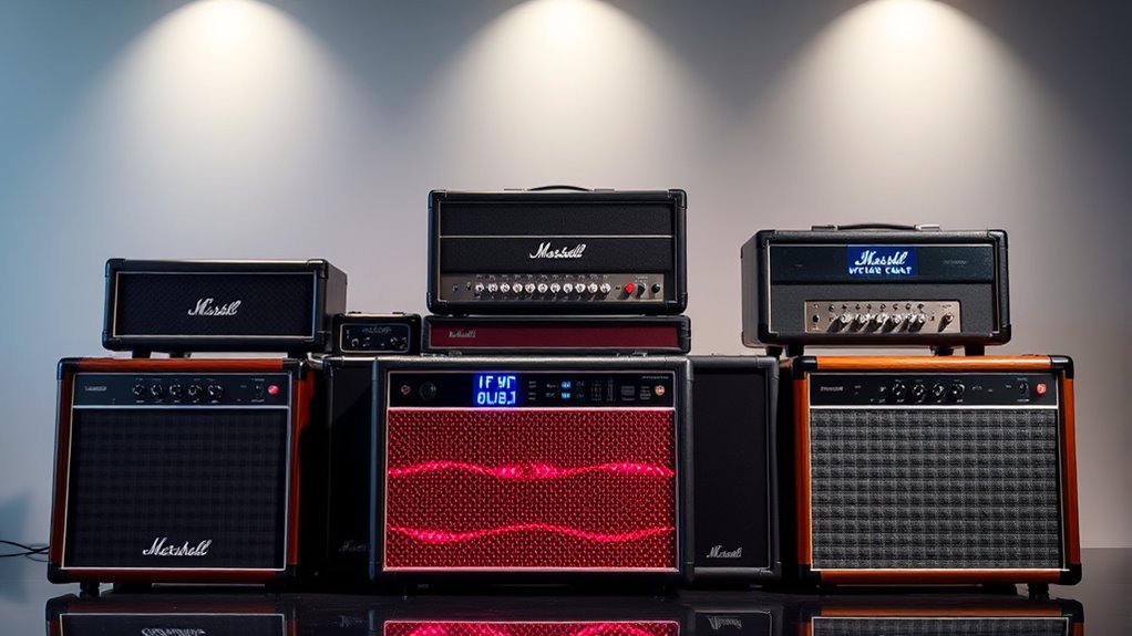 Premium build quality and aesthetics in luxury amps truly set them apart, and I believe it’s because they blend craftsmanship with innovative design. I’ve noticed that the best amps use high-grade materials, meticulous attention to detail, and sleek finishes that catch the eye. It’s about creating a visual statement while ensuring durability. When I play one, I feel the quality in every touch, making the experience as impressive as the sound.