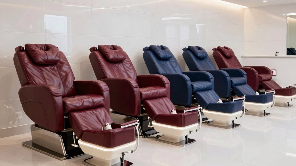They say, “A penny saved is a penny earned,” and that’s true for high-end pedicure chairs. I’ve found that many luxury models with plumbing are surprisingly energy-efficient, thanks to modern features like smart controls and eco-friendly systems. These chairs use less water and power, helping you save on utility bills without sacrificing comfort. Investing in energy-efficient equipment means you get luxury and savings in one stylish package.
