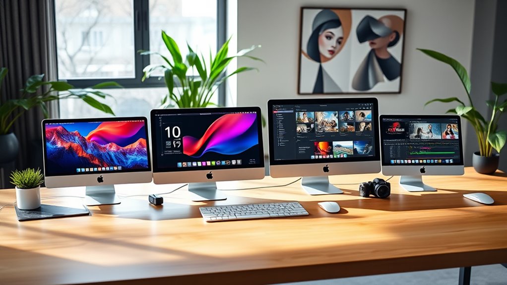 Yes, the Mac Mini can support multiple high-resolution external monitors. Depending on the model and ports, I can connect up to two 6K displays via Thunderbolt and HDMI. For creators like me, this setup is perfect for multitasking and expanding workspace. Just make certain your Mac Mini has the necessary ports or use adapters, and you’ll enjoy seamless, high-quality visuals across all screens.