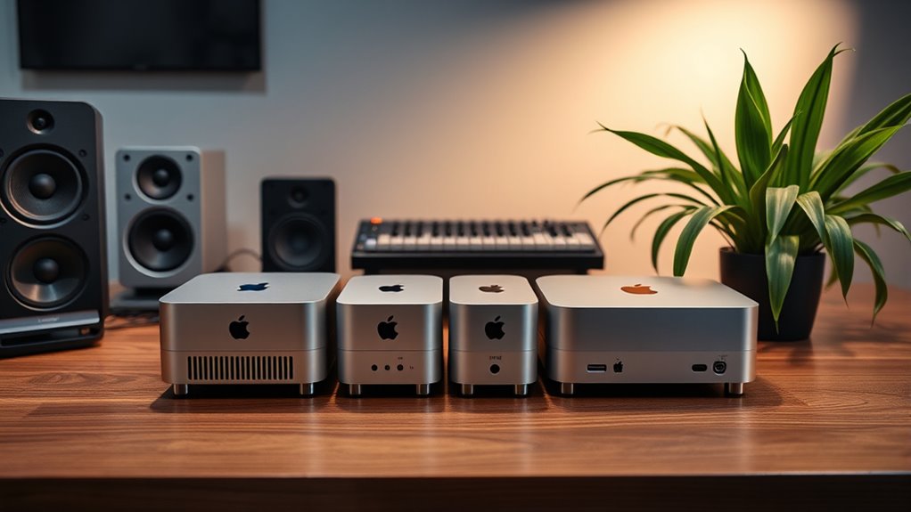Choosing a Mac Mini for your home studio means paying close attention to processing power, as it directly impacts your ability to handle demanding tasks like audio processing, video editing, and 3D rendering. A multi-core CPU with at least 10 cores greatly enhances performance when multitasking or working on resource-heavy projects. Higher-performance chips, especially those with advanced neural engines and hardware acceleration, can cut down rendering and encoding times, streamlining your workflow. It’s also essential to match your processor choice to your project’s complexity; more demanding tasks require more robust CPU and GPU configurations. Remember, upgrading to a higher RAM capacity complements your processor, ensuring smooth multitasking and handling large files efficiently. Properly evaluate your processing needs ensures your Mac Mini can support your creative ambitions now and in the future.