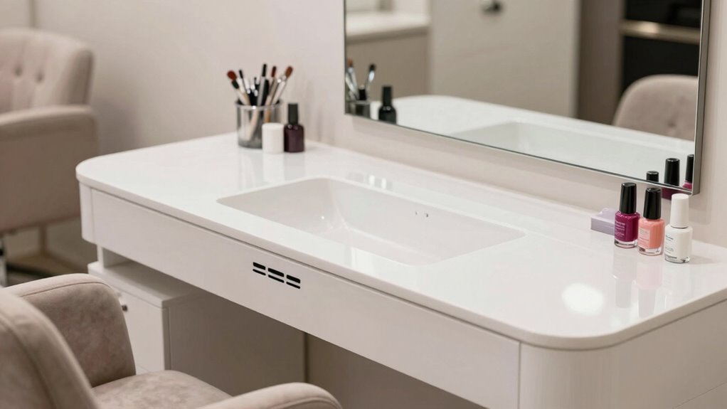 Sturdy construction and a well-balanced weight distribution are vital for a manicure table with a built-in vacuum, as they prevent wobbling or tipping during treatments. A solid frame and legs that support the weight of equipment and supplies without sagging are essential. Lockable caster wheels add to mobility, allowing you to move the table easily while guaranteeing stability when locked in place. The wheels should have secure locking mechanisms to keep the table steady during use. Additionally, a well-designed base with a low center of gravity enhances overall stability, especially when moving or bumped. This combination of stability and mobility ensures a safe, reliable workspace, giving both client and technician confidence during manicures.