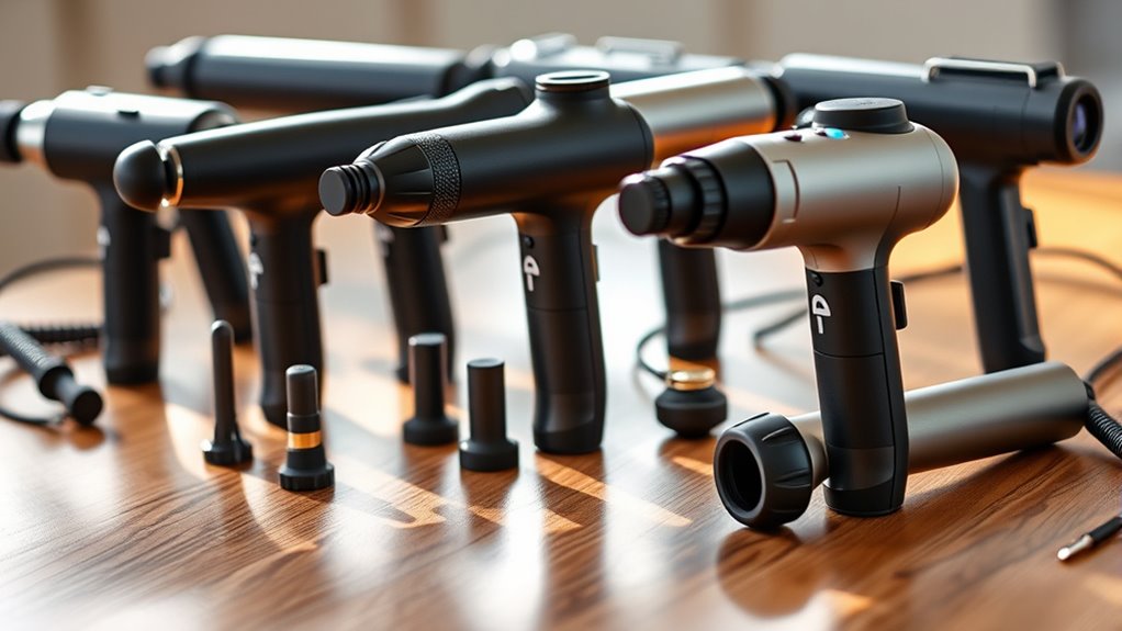 Since different muscle groups and tissue types respond best to specific types of massage heads, having a variety of attachments is essential for an effective recovery routine. A good massage gun offers a range of heads—like foam rollers, bullet tips, and flat heads—that target muscles precisely. Interchangeable attachments let you customize the intensity and focus for pain relief or relaxation, making the device adaptable to your needs. Compatibility with multiple head types boosts versatility, allowing use for general relaxation or deep tissue work. Quick, secure switching between attachments ensures seamless treatment sessions without wasting time. Additionally, high-quality, durable heads improve effectiveness and longevity, making them a smart investment. Overall, versatile attachments greatly enhance the massage gun’s performance and your recovery experience.