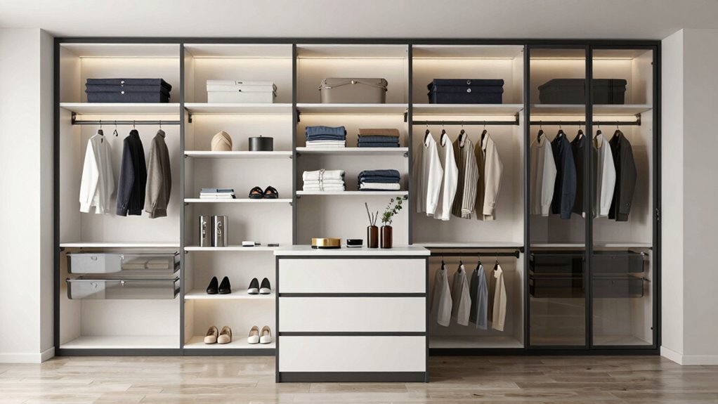 Opting for a modular closet system with flexible customization options allows you to tailor your storage space to your specific needs and room dimensions. Adjustable shelves and rods make it easy to customize the layout, fitting everything from shoes to bulky sweaters. Many systems feature detachable or repositionable components, so you can reconfigure your closet as your needs evolve. You can add or remove drawers, shelves, and hanging rods to maximize space and improve organization. Some systems even support expansion through additional modules, giving you a scalable solution as your storage requirements grow. Personalizing your setup not only enhances functionality but also boosts aesthetic appeal, allowing you to create a closet that truly fits your style and space.