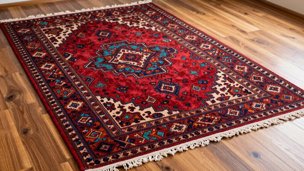 Did you know that direct sunlight can fade up to 80% of a rug’s color in just a year? To prevent fading, I recommend keeping your Moroccan rug out of direct sunlight or using UV-protective window treatments. Rotating the rug regularly also helps. I always make sure to spot clean promptly and avoid harsh chemicals, so my rug keeps its vibrant beauty over time.