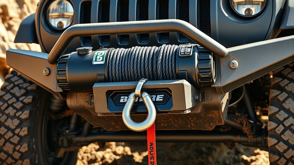 Selecting a winch that can handle your vehicle’s weight is just the start; durability and waterproofing are equally important to keep your gear reliable in tough conditions. A winch with an IP68 or IP67 rating can withstand prolonged water submersion, dust, and mud, ensuring it functions in the most demanding environments. Using corrosion-resistant materials like Dacromet-coated screws and powder-coated housings prevents rust and deterioration over time. Sealed components, including control boxes and electrical connections, minimize water ingress, reducing the risk of electrical failures. Synthetic ropes are a smart choice because they resist moisture and corrosion better than steel cables, maintaining strength in wet conditions. Overall, a well-constructed, waterproof winch with durable finishes will stand up to the harsh realities of off-road adventures for years to come.